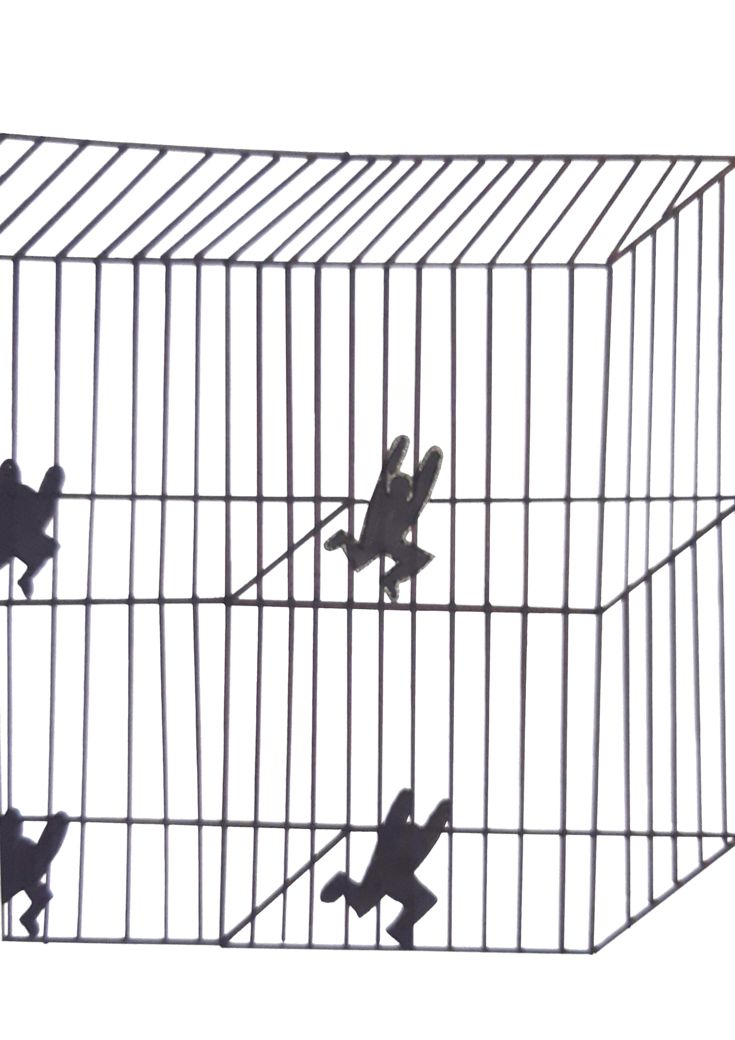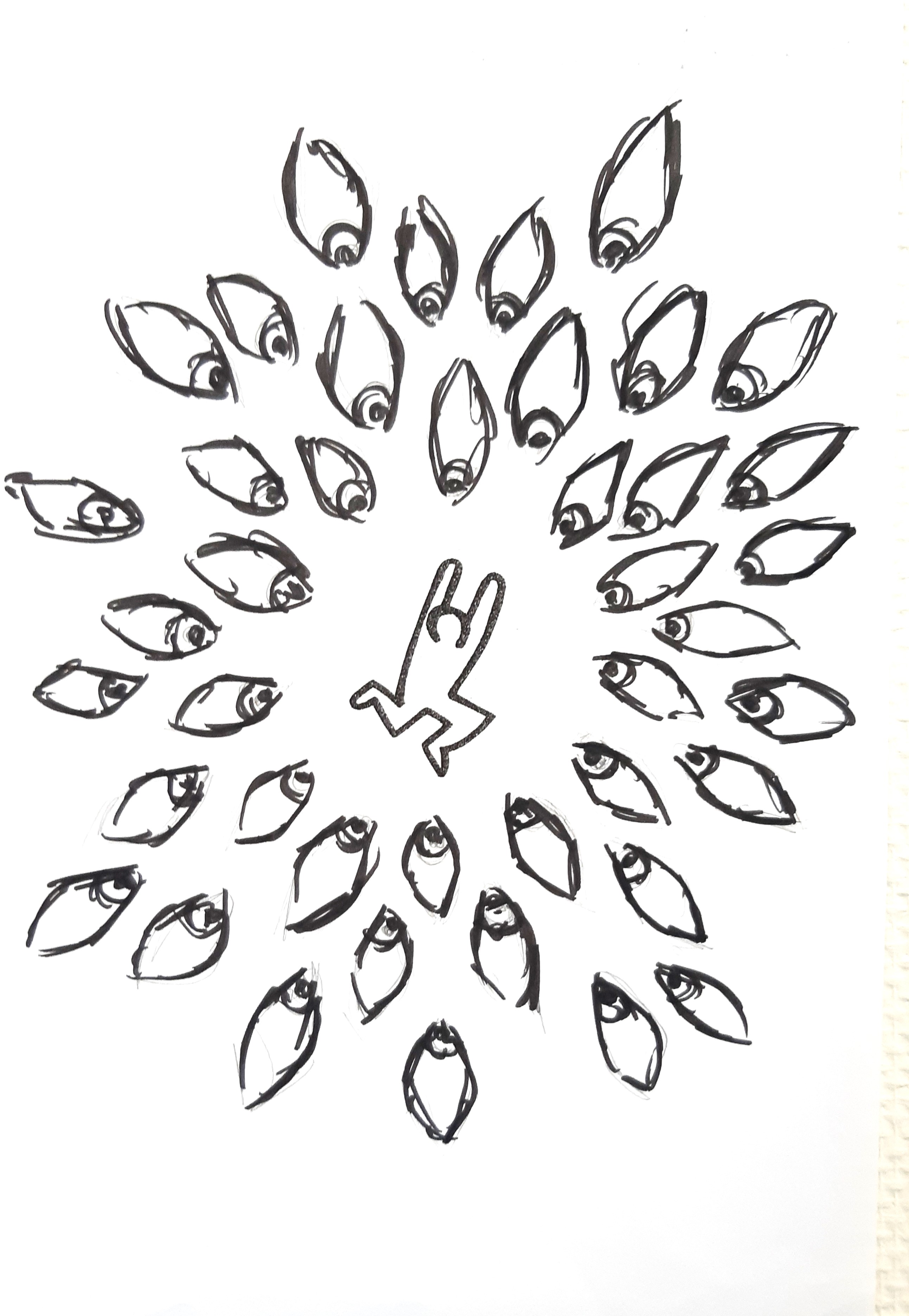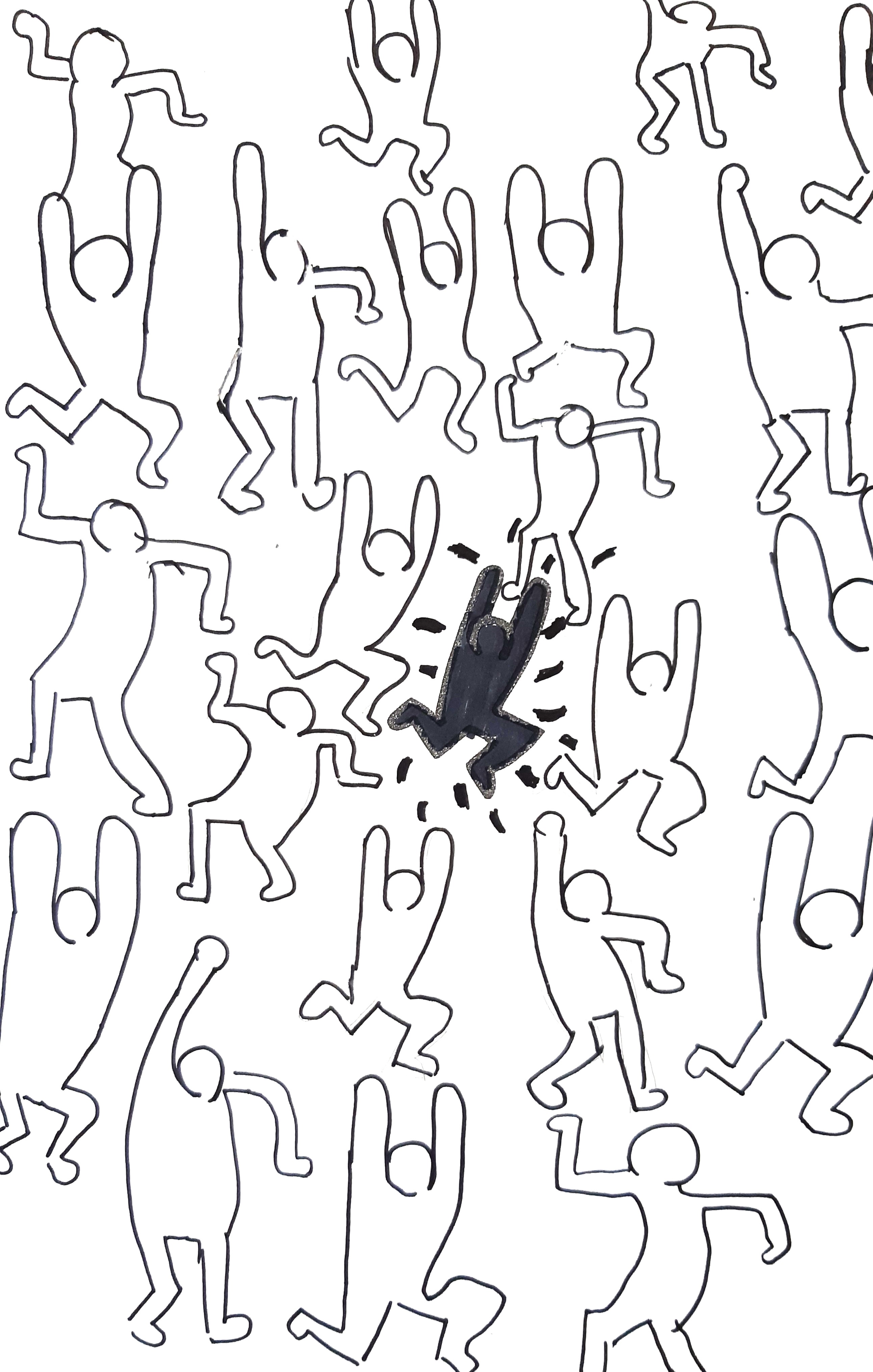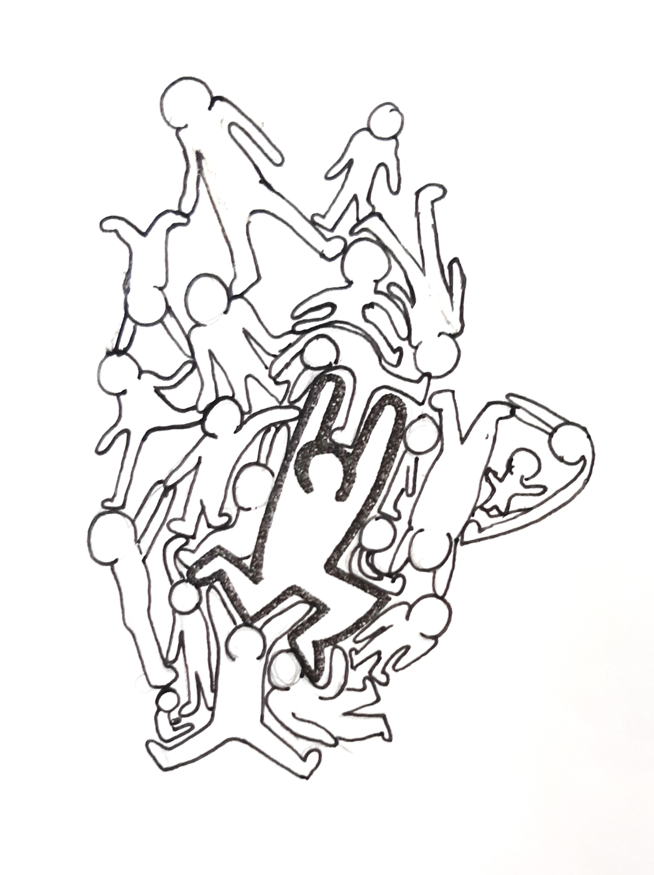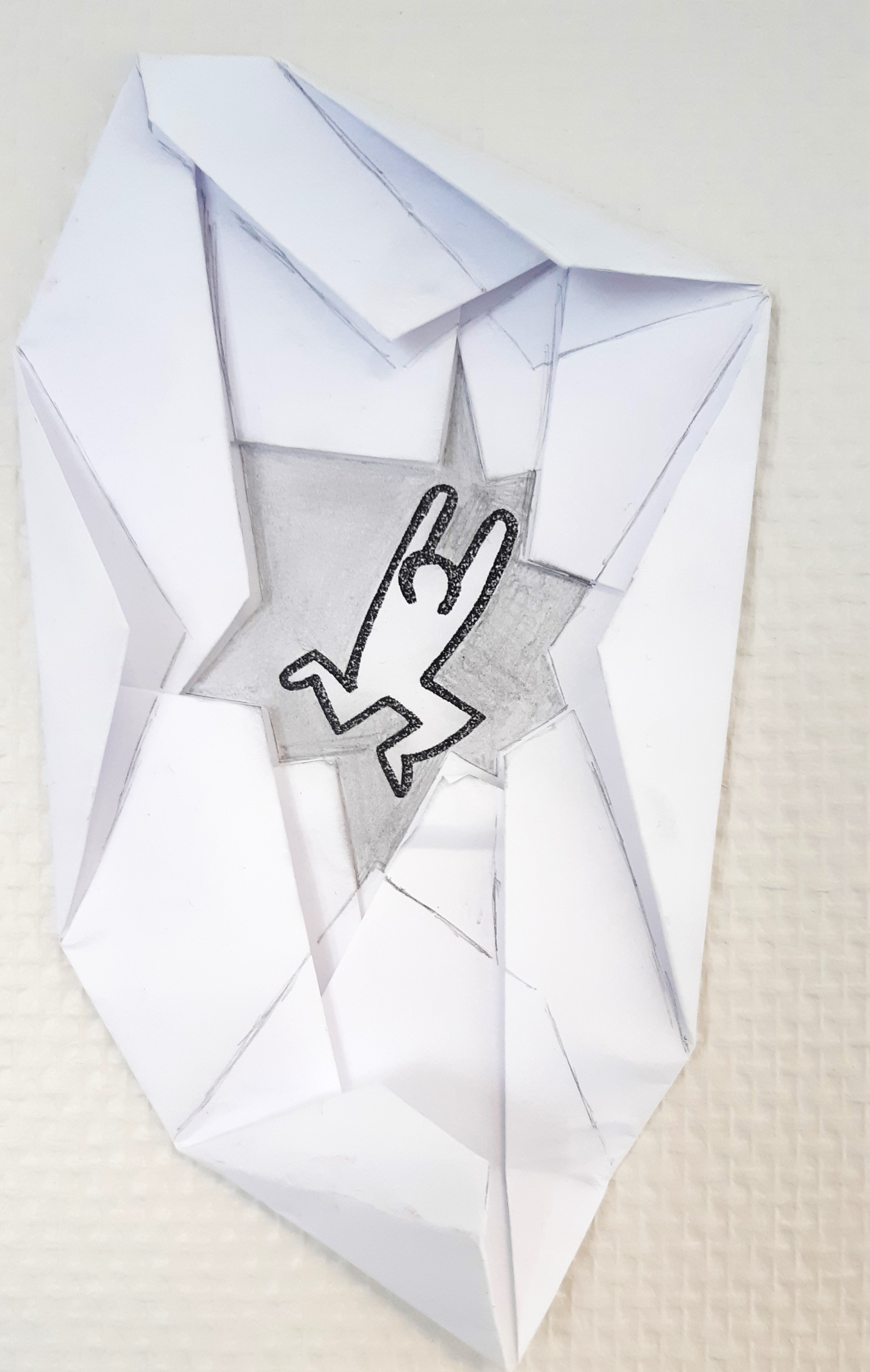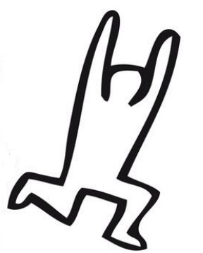 Ce personnage est emblématique de la pratique de Keith Harring. Cerné de noir, souvent rempli de couleurs vives, il est multiplié, répété... animé! Il recouvre murs et toiles. |