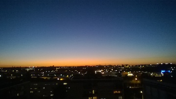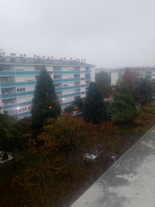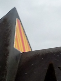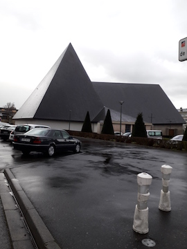 Le soleil se cache derrière les nuages. Il revient de temps en temps et il se cache de nouveau, puis revient toutes les minutes. Devant l'église les nuages nous gênent pour prendre des photos, le soleil peut rendre la photo belle. Le soleil fait des reflets contre l'église. Quand la voiture roule, c'est flou sur toutes les photos. La photo peut être gâchée ou améliorée.