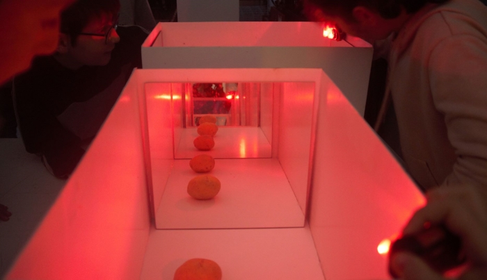 Le dispositif est interrogé : "Est-ce que le vidéoprojecteur, la table et les objets posés sur la table font partie de la présentation ? - Non, uniquement l'oeuvre... - Qu'est- ce que tu appelles l'oeuvre ? - L'image, la projection." D'autres élèves interviennent afin d'expliquer qu'ils ne sont pas d'accords, que sans le reste du dispositif la présentation est moins intéressante. Le débat est ouvert...