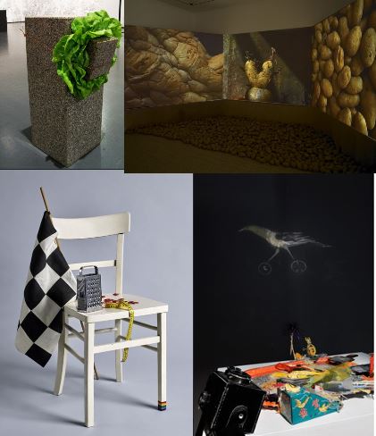 Les élèves se regroupent ensuite sur des bancs afin de découvrir les références artistiques. L'oeuvre de Loriot et Melia permet de revoir la question du dispositif. Les élèves choisissent ensuite les oeuvres qu'ils souhaitent regarder, commenter et analyser. Giovanni Anselmo, Sans titre, 1968, granit, fils de cuivre et laitue fraîche, 70 x 23 x 37 cm. George Brecht, Chair Event, 1970, chaise en bois, ruban adhésif, râpe en métal, drapeau, mètre ruban, jeu en bois , 84 x 37 x 39 cm. Agnès Varda, Patatutopia, 2003, triptyque, installation visuelle et sonore, pommes de terre. Chantal Mélia et François Loriot, L'auréolus, 1992, objets divers réfléchissants, miroirs, plateau, appareil photographique, oiseau-leurre.