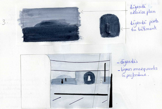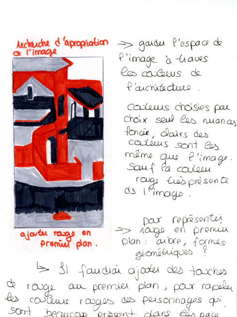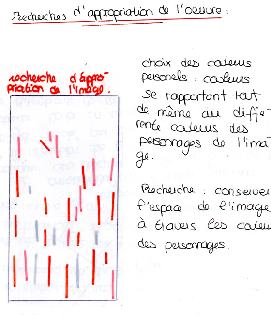 A l'issu des recherches préalables, les pages de carnet ont été scannées et projetées à la classe de manière à mutualiser les découvertes faites afin de mettre en évidence la spécificité des espaces figurés, le degré de profondeur ou de planéité. Par ailleurs sont apparus aussi des invariants (rôles des obliques, étagements des plans, rôles des couleurs dans la circulation du regard, rôle « contrariant » des aplats de couleur)...