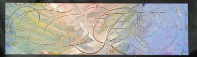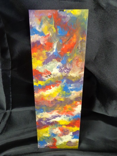 "J'ai eu envie de faire une sorte de dégradé abstrait. J'ai donc commencé par faire un dégradé avec du jaune, du bleu et du rouge, les trois couleurs primaires. De fil en aiguilles, j'ai mélangé les couleurs et j'ai ajouté du blanc. Pour finir, mon deuxième geste a été d'utiliser le dos d'une pince à linge pour tracer des chemins sur le support de peinture. "
