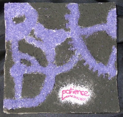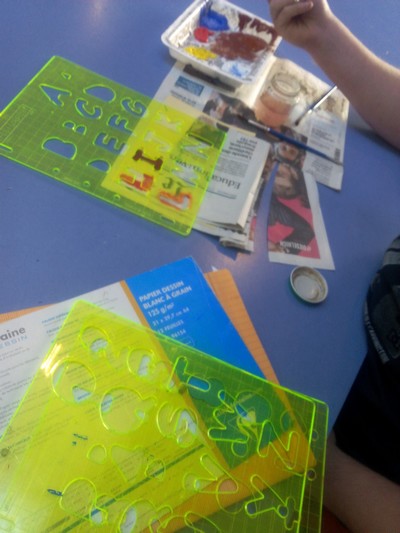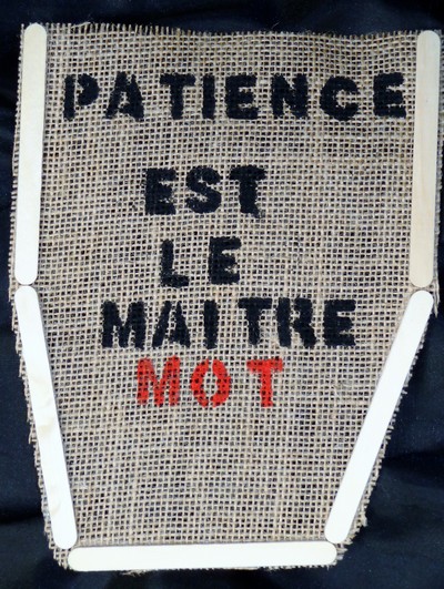 "J'ai choisi la simplicité : des couleurs simples. Pour moi, prendre le temps de faire les choses, c'est ne jamais abandonner. J'ai choisi deux gestes, l'écriture et le collage. Pour cela, j'ai utilisé le pochoir pour gagner du temps. Les lettres restent belles et simples."