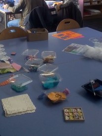 Outils graphiques, argile, pochoirs, chutes de tissu, peinture, fil et aiguilles, carton, graines, perles, papier crépon...