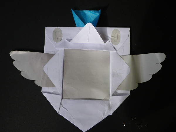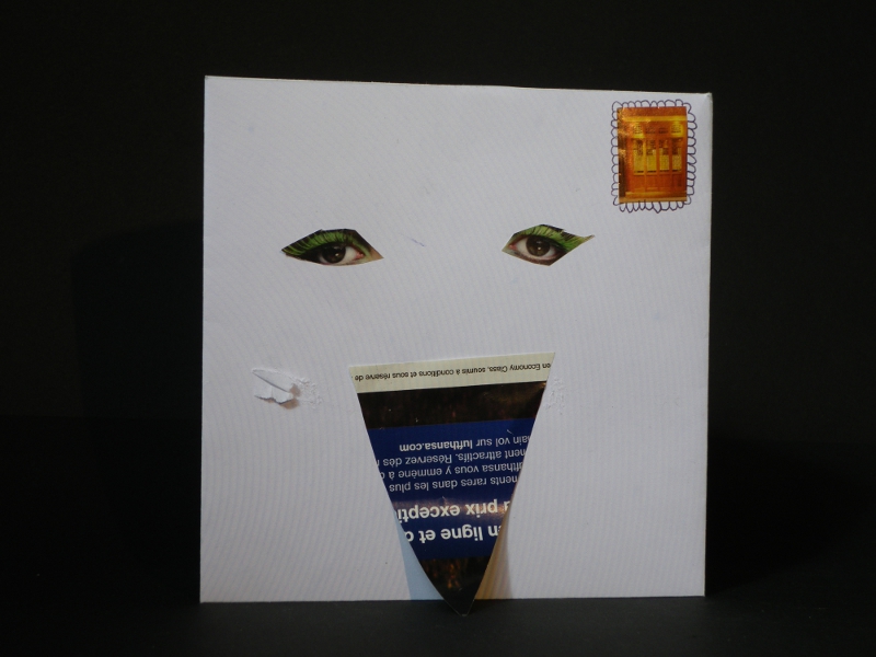 Matériaux / matériels : une enveloppe (imposée), des papiers divers de couleurs, papiers journaux et magazines (plus ou moins nombreux en fonction des tables), ficelle, ruban adhésif.