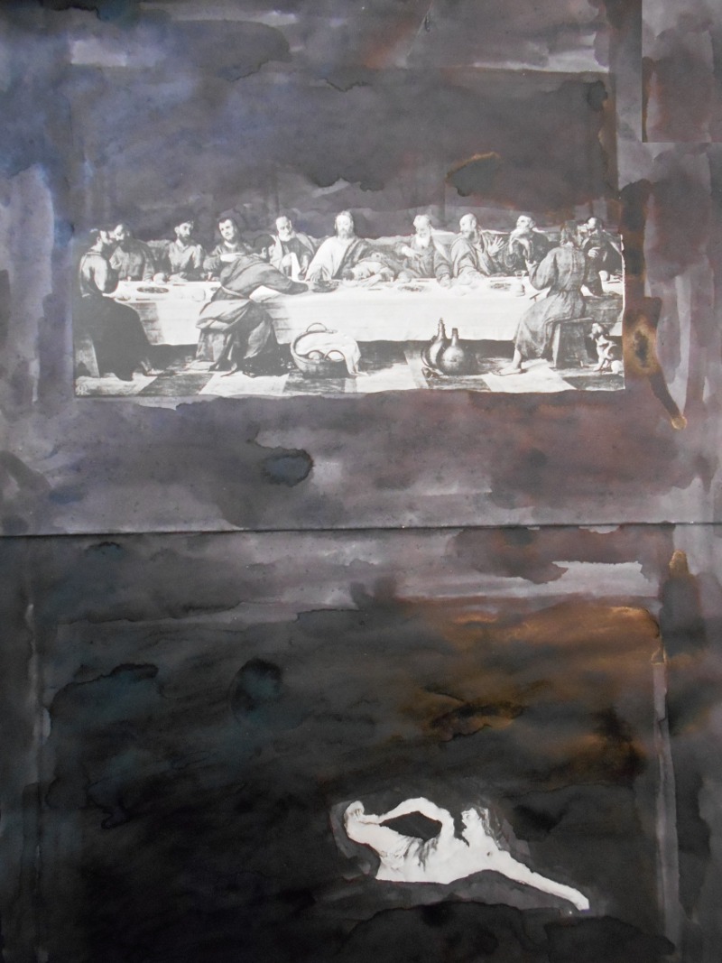 Le recouvrement des marges permet de rassembler les deux pages en une. Dans la production ci-contre, l'élève a recouvert une grande partie de la surface de la double page. Seule la Cène, dernier repas de Jésus avec ses 12 apôtres, reste visible sur la partie supérieure. La partie inférieure présente le christ en croix: conséquence de la trahison de Juda annonçée par Jésus lors du repas.
