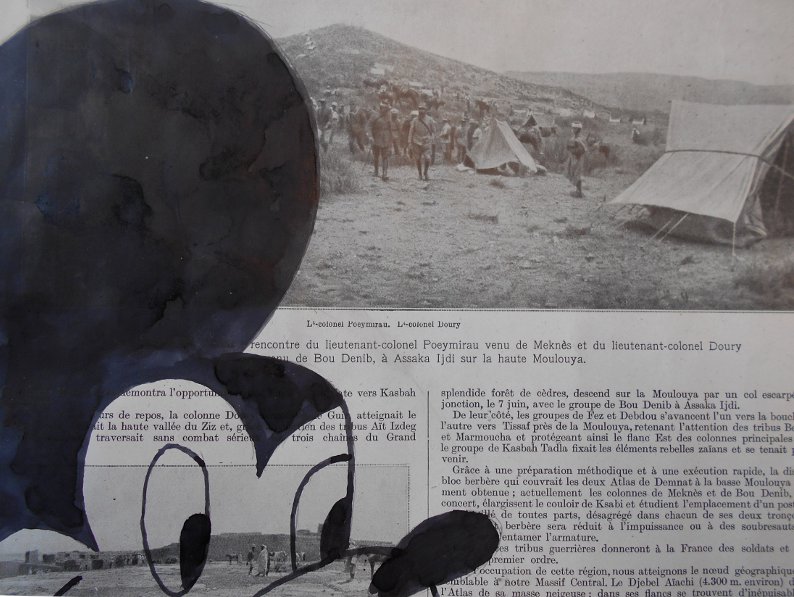 Le dessin à l'encre se superpose au texte et à la l'image imprimés. Le dessin enfantin du héros de Disney se confronte au reportage de guerre du journal. Deux mondes opposés cohabitent sur la même page. La fiction semble l'emporter sur cette actualité bien lointaine pour l'élève telle une revanche sur la réalité.... Cette production rappelle l'oeuvre de Claude Levêque, Arbeit marcht frei, 1992.