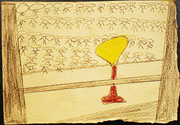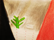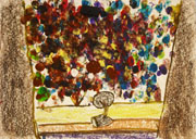 Dans d'autres travaux, les murs sont devenus de la couleur, la foule s'est transformée en petits points, gribouillages, surface d'une seule couleur... Pour ceux-là, nous avons gardé les zones claires ou foncées, même si c'est parfois plus écarté sur nos dessins que sur la photo. Pour faire cette partie du dessin, certains ont juste fait des empruntes digitales qui reproduisent la répétition des têtes de la foule, ils ont « reproduit » le rythme de la photo. Sur les travaux, c'est souvent sur le « milieu » que c'est le plus animé, c'est là en effet qu'on note le plus d'efforts pour réaliser une surface « vibrante », « picturale », où se multiplient les couches, les coups de crayons, les expériences avec les matériaux. On remarque que dans ce type de dessin, on ne parle plus de représentation, mais uniquement de formes, surfaces « animées » ou homogène, taches, etc. Ces dessins ne sont plus des images, puisqu'on ne reconnaît pas vraiment ce qui est représenté, on dit qu'ils sont abstraits : ce ne sont pas des images, car ils ont transformé les personnages en petits points et les murs en couleur .On reconnaît seulement si on a vu la photo. On peut imaginer autre chose, ou observer les formes, couleurs, matières pour elles mêmes.