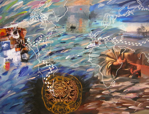« Pour que les images soient intégrées dans la peinture, j'ai peint en superposant diverses couches de peinture de manière à ce que les couleurs ne passent pas de l'une à l'autre trop brutalement. Enfin, pour rendre l'ensemble plus homogène, j'ai terminé mon travail en traçant une carte en blanc, comme un calque sur toute la peinture. ». Laly