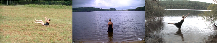 Le voyage à Vassivière s'offrait donc à moi comme une belle opportunité de mettre en œuvre mes idées à la manière de NADJ, en faisant de l'île une scène, un peu comme Pina BAUSCH qui elle emmenait la nature dans les théâtres (terre, pierre, eau). J'ai donc réalisé une variation et laissé l'espace influencer mes mouvements pour réaliser un film qui finalement se décline en 3 vidéos sur les éléments :