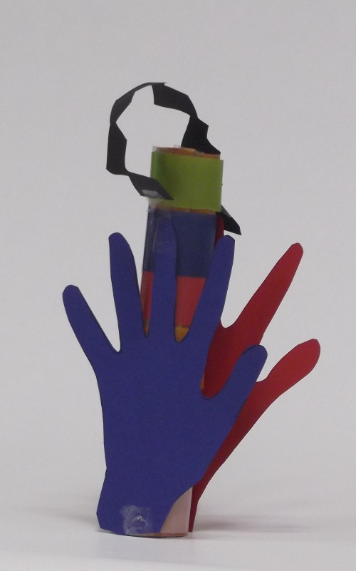 Finalement, passé le moment d'excitation lié à une situation inhabituelle, les échanges auront été riches, et lorsque nous remontons en classe, chacun sait ce qu'il a à faire pour terminer le travail. Certains ajoutent, d'autres reviennent sur ce qui avait été fait. Dans un groupe, chaque élève fait le contour de sa main sur une feuille de couleur différente et le découpe avant de l'intégrer au travail :