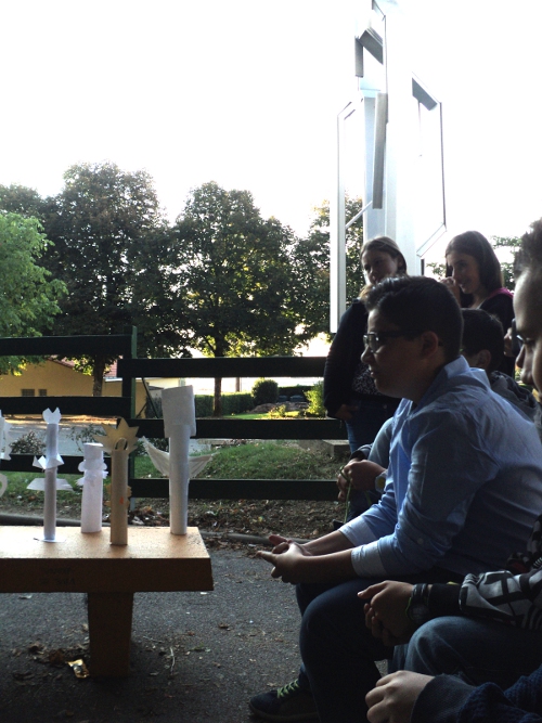 Le cours suivant, les productions sont disposées à l'extérieur, sur un banc en pierre à l'entrée du bâtiment principal. Le caractère inhabituel de la situation et le vent qui fait tomber les productions rend l'attention difficile à mobiliser. Mais face à ces totems qui ne veulent pas tenir debout, des questions se posent et la discussion s'engage autour des notions de verticalité, de socle. Puis la sculpture de Millecamps à côté de laquelle nous nous étions installés semble apparaître soudainement. Un dialogue s'instaure entre les productions et l’œuvre. Des similitudes sont repérées, à commencer par la verticalité qui ouvre à des questions de sens. Si les élèves ont pu associer aisément la verticalité des totems amérindiens à la fonction de représentation du clan, celle de l’œuvre de Millecamps est plus difficile à cerner.