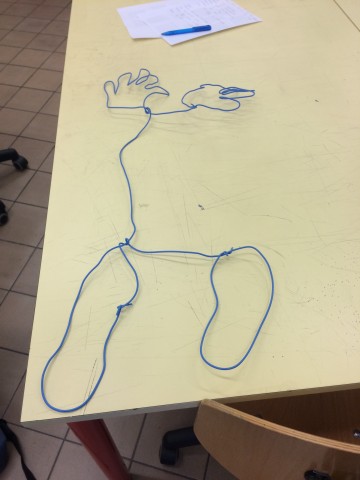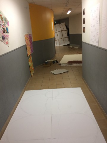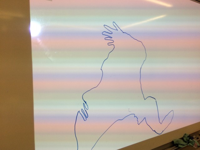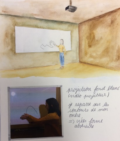 Grâce au vidéo-projecteur, j'ai pu repasser sur mon ombre projetée avec un feutre. Comme le tableau est en hauteur, j'ai dû utiliser une chaise afin de projeter l'ombre de mes jambes, pieds etc.