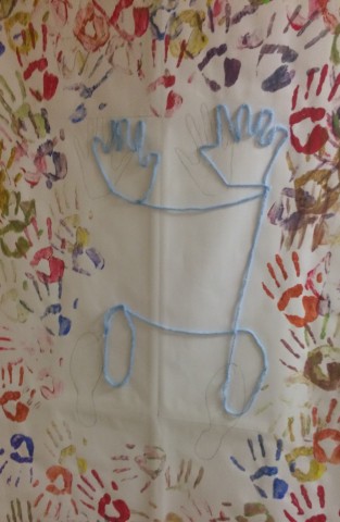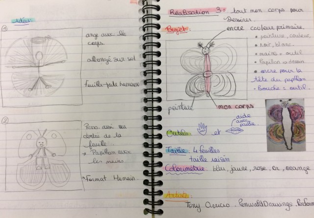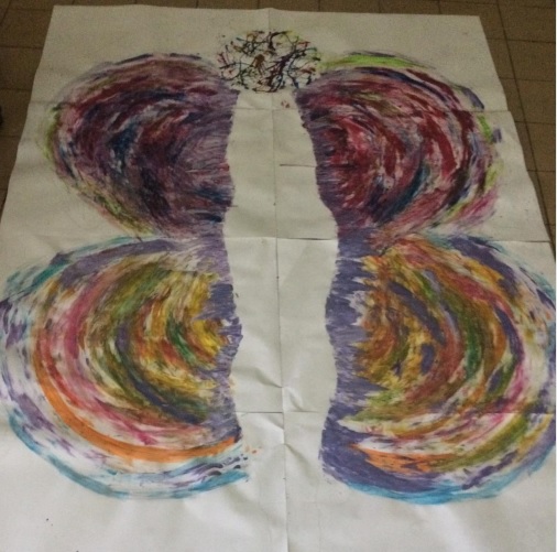 "Pour réaliser ce dessin avec tout mon corps, j'ai décidé de m'asseoir au milieu d'une grande feuille (deux fois plus grande que moi assise) puis j'ai utilisé mes mains comme outil. En tendant mes bras le plus loin possible, j'ai fait comme des demi-cercles sur chaque côté de mon corps. Avec cette technique que j'ai répétée deux fois, j'ai réalisé un papillon et mon corps représente le corps du papillon.
