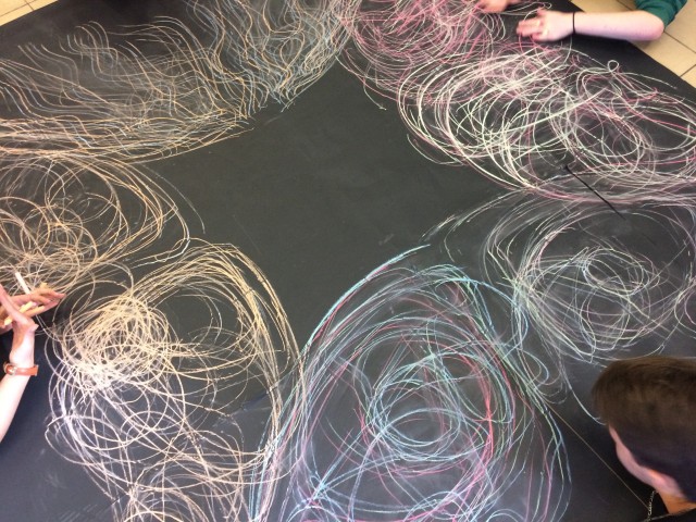 Il s'agit alors d'élargir cette pratique usuelle (assis à sa table) à l'espace en impliquant tout le corps et ses possibles actions.