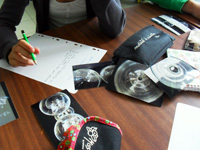 L'infirmière du collège m'a donné une dizaine de sacs à mains excentriques décorés de bois, écailles, fanfreluches et autres. Les élèves ont représenté ces sacs en utilisant plusieurs outils depuis le début de l'année. La question du hors-champ a été entrevue lors des premiers dessins... Une analyse de certains dessins a beaucoup tourné autour de la notion de détail : ce mot pouvant prendre plusieurs sens : la forme précise du trait, l'échelle de la représentation, le détail comme forme inattendue apparue après observation du « motif ».