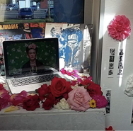 On y reconnaît une femme brune, ils rappellent les portraits de la femme sur les vinyles. C’est Frida Kahlo, artiste mexicaine du 20ème siècle. Les tirages de photomaton nous renvoient à ceux des surréalistes parisiens des années 20, qui voulaient tant que Frida se reconnaisse dans leur mouvement et c’est donc avec ironie que cette citation a été conçue. Dans l’angle droit, un socle blanc sert d’autel à un ordinateur portable, sur l’écran une photo de l’artiste, dans les enceintes de la musique. Des fleurs fraiches disposées autour de celui-ci accentuent l’ode à cette femme que nous avons créée, elles évoquent également les vanités et le côté éphémère de la vie de l’artiste en opposition à sa renommée. Enregistrer