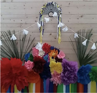 En premier lieu est visible une structure en bois sur laquelle nous avons fixé des rideaux et des fleurs multicolores en papier. C’est une porte de séparation entre deux univers, afin de mettre en place une intimité. Cette frontière ne laisse échapper que quelques sons à peine audibles, cela invite le spectateur à explorer cette mystérieuse atmosphère. En avançant vers ce portail, petit à petit les sons deviennent des musiques, puis des paroles, et enfin on perçoit une dissociation de langages, trois langues. L’anglais et le français nous semblent familiers, c’est sûrement parce qu’on peut y reconnaitre des musiques des années 60 aux années 90. Quant à cette autre langue, l’espagnol, elle est là pour nous faire penser à un pays hispanique, très dansant et envoutant, le Mexique.