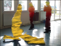 Résultats plastiques décevants alors que les élèves avaient une véritable intention : jouer entre la dramatisation des silhouettes et la banalité du décor. Ici la version numérique est très vite plus satisfaisante.