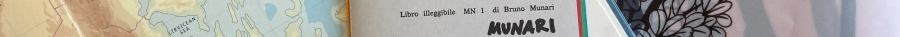 Dans ce coffret se trouve un tout petit livre d'artiste illisible MN1de Bruno Munari, constitué de quelques morceaux de papier et modestement relié par un bout de ficelle, sans texte et simplement agrémentés de quelques signes.