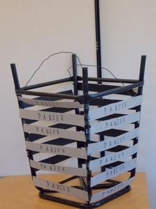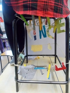 « Nous avons ajouté des fils aux pieds du tabouret car le mot que nous devions utiliser était « pince à linge ».Ce mot apparaît car nous avons découpé dans du tissu les lettres et nous les avons suspendues comme des vêtements avec des pinces à linge. Le mot est à la fois le tissu, du linge et un mot lisible. Le tabouret ne perd pas sa fonction car on peut toujours s'asseoir mais devient aussi, grâce au mot et à la façon dont il est écrit, un séchoir à linge. »