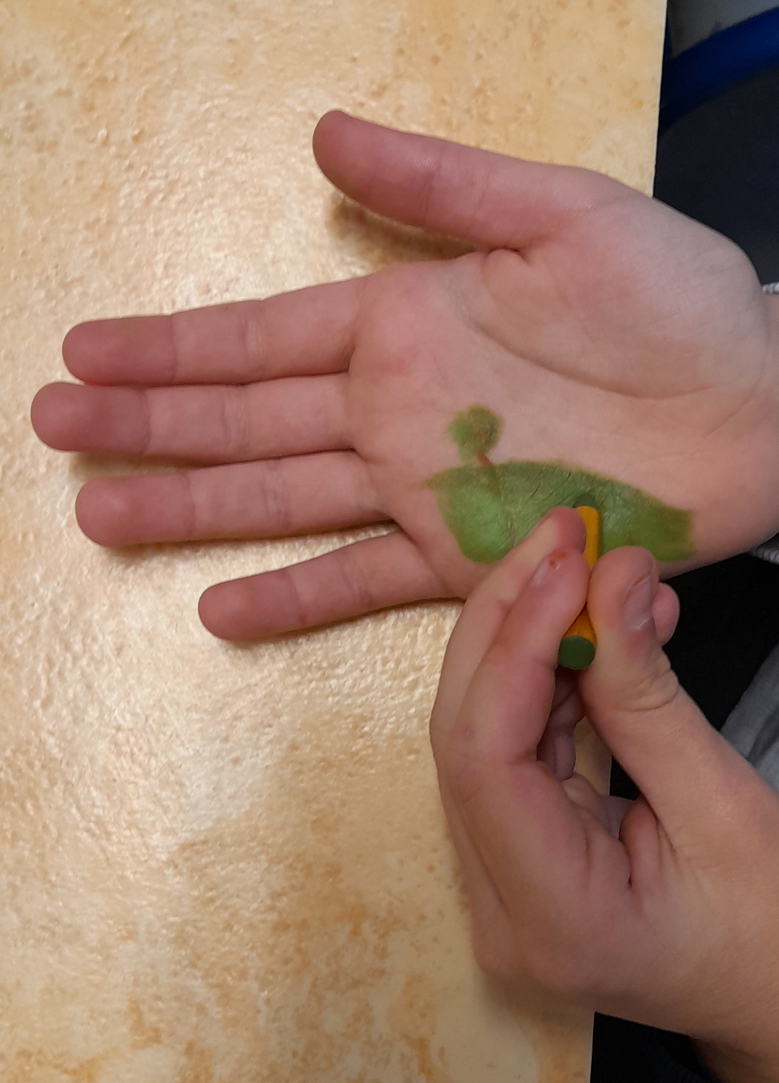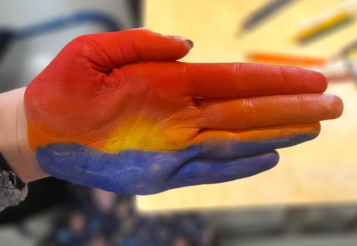 Le travail commence directement dans ou sur une main, avec des crayons de maquillage utilisés traditionnellement afin de se grimer pour le carnaval ou autre fête déguisée. Ces crayons sont gras et inoffensifs pour la peau. Ils se nettoient facilement à l'eau et au savon. Je n'avais toutefois pas anticipé que certains élèves hésiteraient, au départ, en expliquant que leurs parents leur interdisaient d'écrire sur leurs mains !