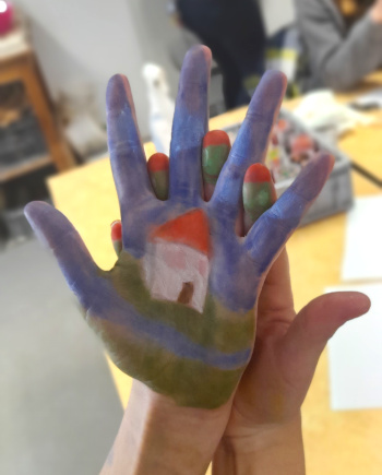 En restant attentif au rythme des représentations en cours, interrompre la pratique pour que chacun présente son paysage aux autres permet de mettre à jour des trouvailles insoupçonnées ! Comme c'est le cas d'Angèle, qui imagine une invasion d'extraterrestres dans un jardin entourant une maison qui semble au premier abord très conventionnelle. Les extraterrestres ne semblent pas menaçants, ils sont de sympathiques personnages verts. Dessinés sur les doigts de son autre main, ils apparaissent dans son paysage alors qu'elle fait passer sa main derrière la première. Angèle questionne ouvertement les stéréotypes : la maison cube au toit pointu, les bonhommes verts... et se joue d'un univers enfantin lié aux outils et au support de la pratique du jour.