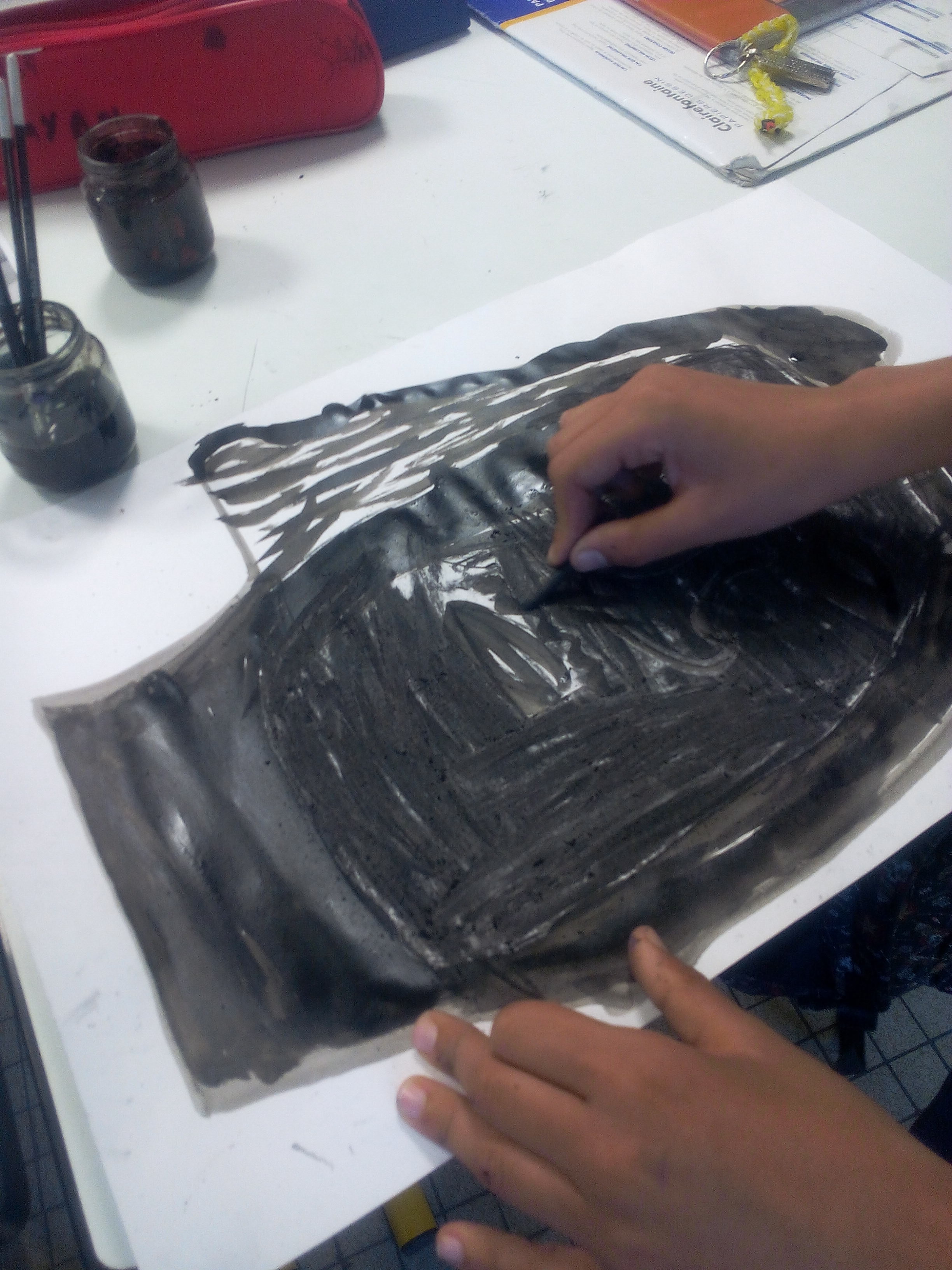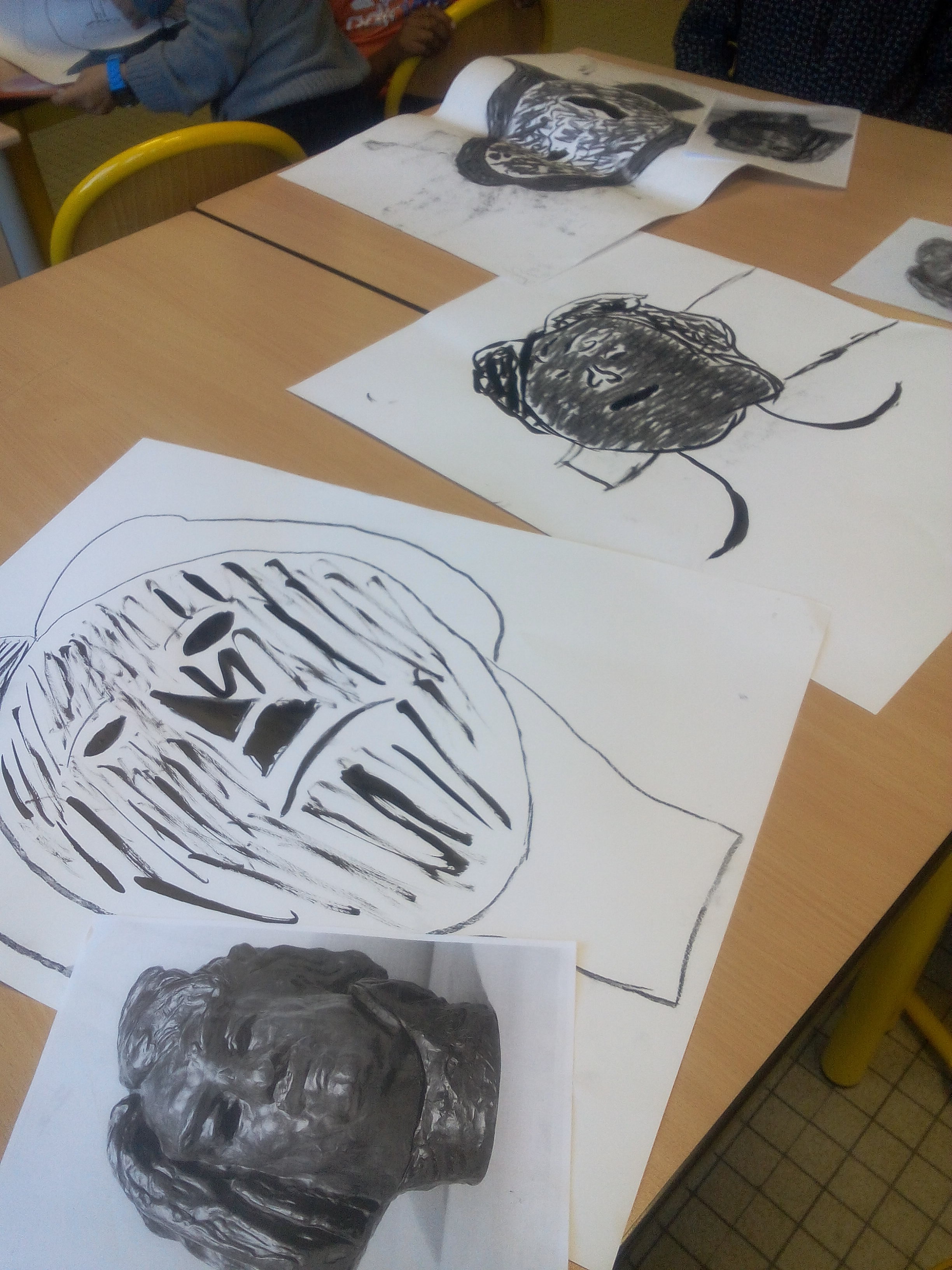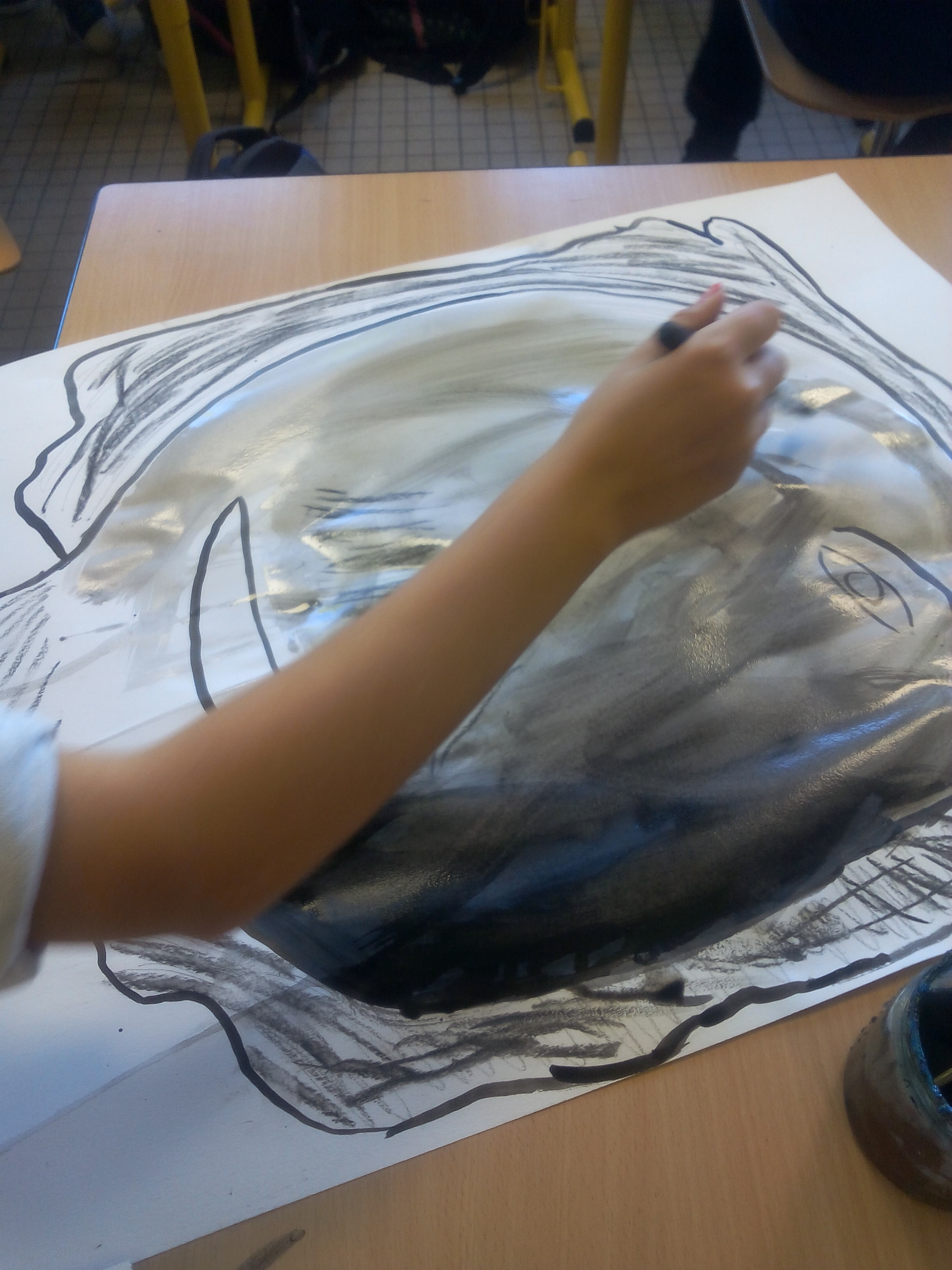"Non mais ce n'est pas grave, ce n'est pas la même émotion, ce ne sont pas les mêmes gestes" Sylvina Y-a-t-il différentes caractéristiques de gestes ou d'outils ? "le fusain est plus nerveux, j'ai fait des grands gestes pour qu'il paraisse énervé, j'ai appris à aller fort ou doucement" Baptiste Qu'apporte le grand format ? "Il m'a apporté la précision" Hugo |