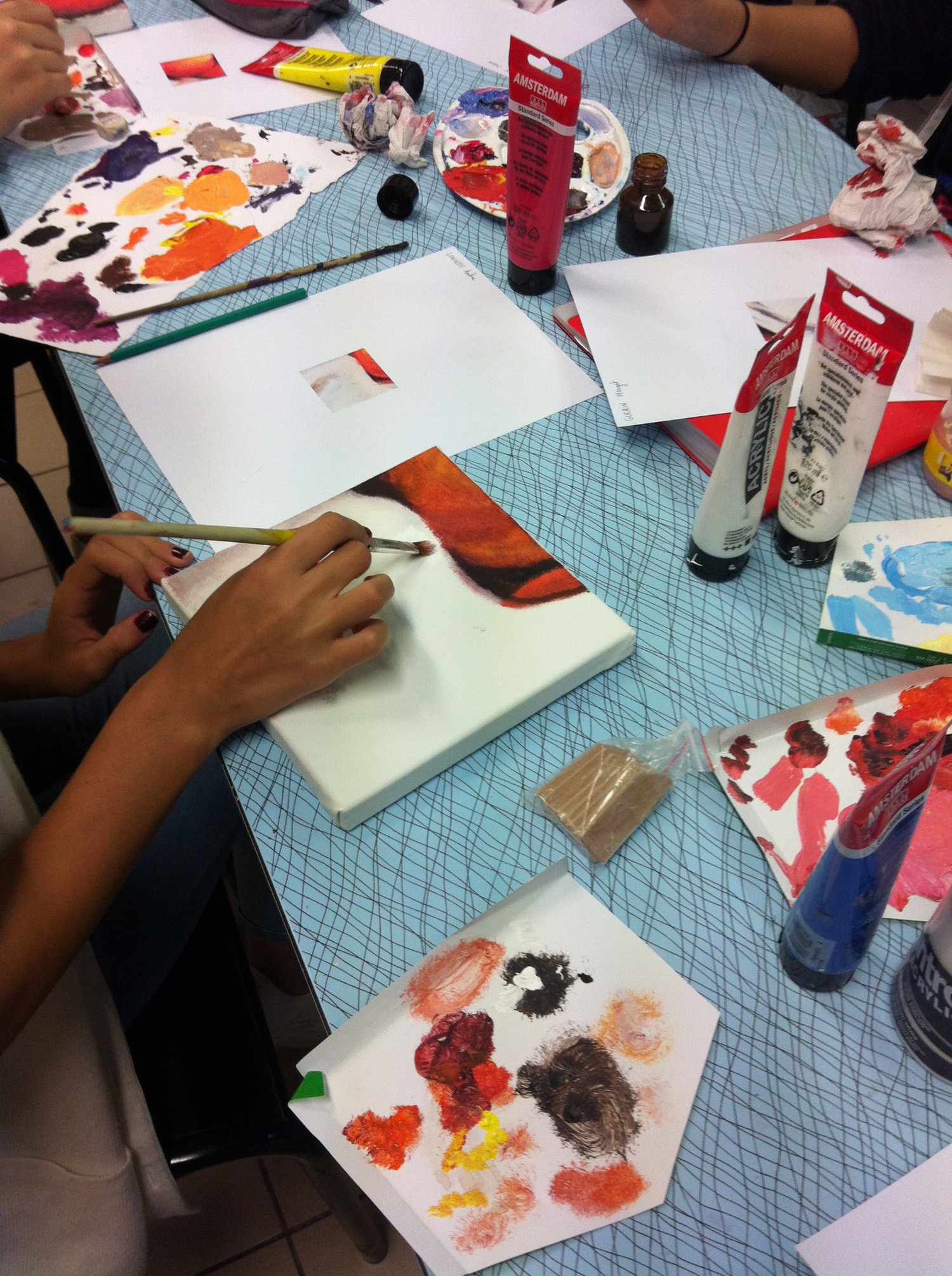 L'ensemble est cohérent, mais montre des interprétations. La proposition "Reprendre en peinture" met en avant les points de vue variés, les interprétations des couleurs, les notions d'espace et de composition. Certaines toiles sont faites à la brosse, chacun a choisi sa technique. Les couleurs sont à l'acrylique pour la plupart, quelques carrés ont été peints à l'aquarelle, deux ont du pastel et du fusain. Il est pour le moins question d'écart.