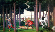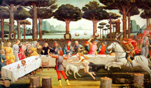 2. Sandro Botticelli, Historia de Nastagio degli Onesti 1483, 2nd tableau, (une seule image, un seul espace, fragmenté par les arbres, au premier plan et à l'arrière plan le même couple dans des postures différentes, il évolue de la droite vers la gauche puis de la gauche vers la droite, le temps se répète à l'infini)