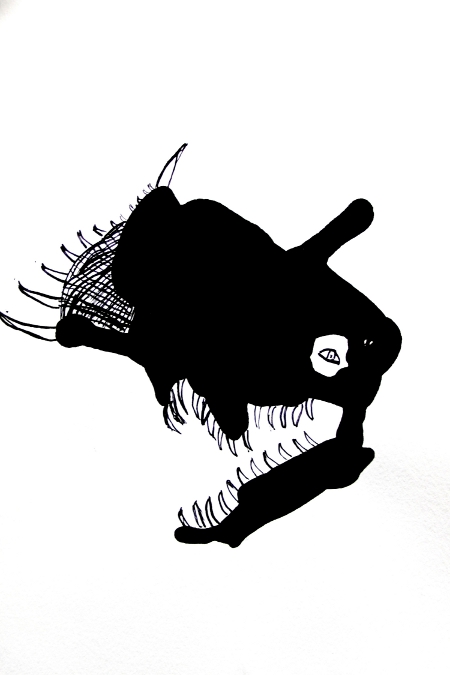 La séance débute par une verbalisation autour du travail précédent sur la tache. Les élèves observent l'ensemble des réalisations et découvrent que dans les taches, avec les lignes, sont apparues des images variées et expressives : des drôles de personnages, des bestioles, des monstres de toutes sortes le plus souvent. Ils réalisent que de simples taches ont émergé des images avec pourtant une grande économie de moyens.