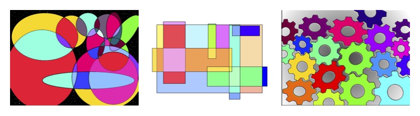 Afin de guider une partie des élèves dans les manipulations numériques, l’enseignant projette son écran sur le tableau. Chaque groupe d’élèves a ouvert un support vierge blanc en format paysage aux dimensions identiques, correspondant à celles proposées instinctivement par le logiciel. Après une petite phase de démonstration de l’usage du logiciel, les élèves démarrent la phase de pratique exploratoire et réflexive. Ils se saisissent rapidement et sans difficultés notoires de cet outil. Ils dialoguent et se conseillent. Durant cette première partie de séance, l’enseignant répond aux interrogations des élèves d’ordres techniques de manière personnelle ou groupée : comment créer des formes ? Comment mettre de la couleur ? Comment dupliquer une forme ? Comment flouter des formes ? Comment créer des calques ? …