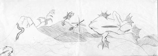 Puis, il leur est alors demandé d'assembler les deux feuilles A4 pour ne faire qu'un seul dessin . Les élèves sont donc amenés à s'interroger sur la disposition des feuilles et le sens de lecture. De toute évidence ils se racontent déjà une histoire pour justifier leur façon d'associer les feuilles.
