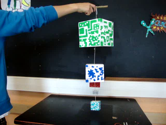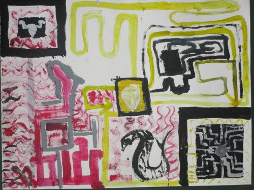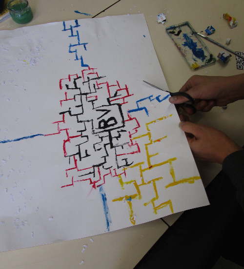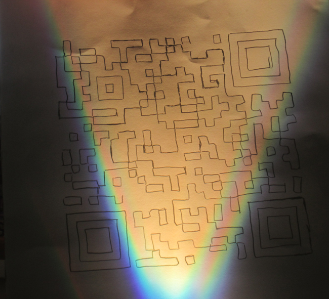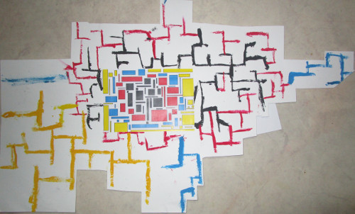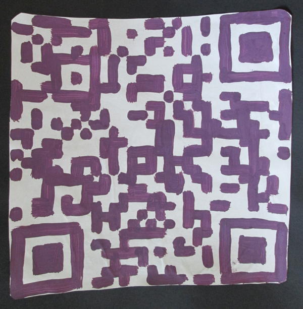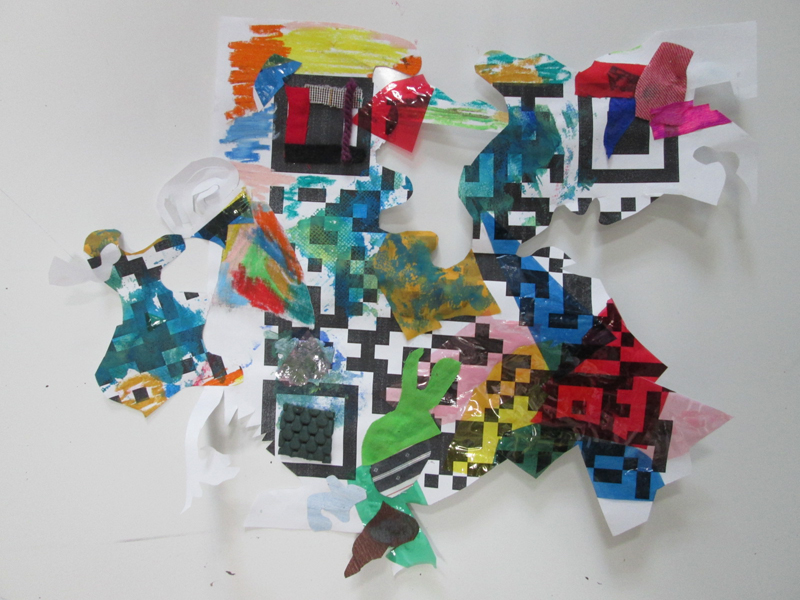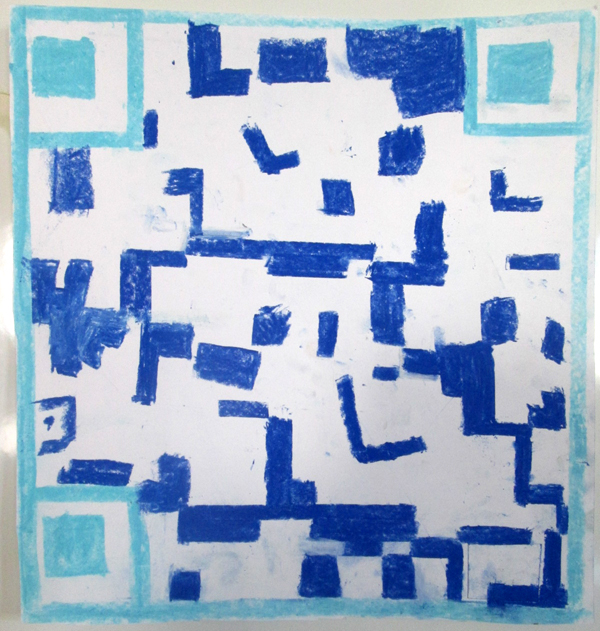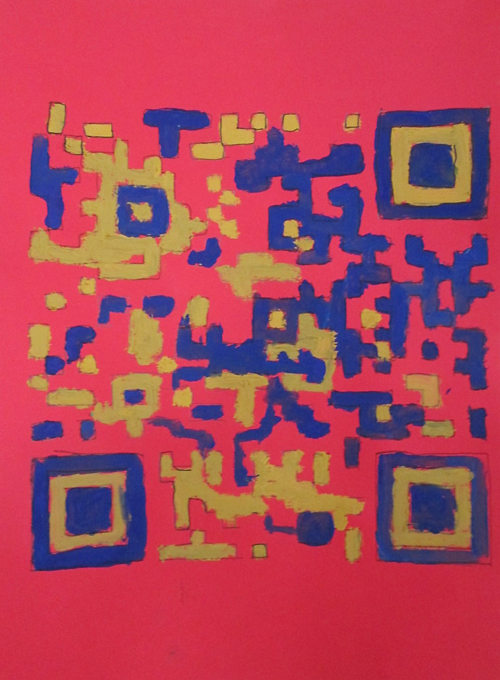«Nous avons essayé de déplier le QR code, en utilisant des lignes de couleurs primaires. Au centre, nous avons collé notre dessin réalisé sur ordinateur. Il garde les formes carrées et rectangulaires du QR code et nous avons utilisé aussi les couleurs primaires.»Victor et Betsaleel | «Nous avons cherché à traduire le QR code d'une manière Expressionniste, sans le copier exactement. Nous avons utilisé notre créativité, et les gestes sans faire attention à ce que cela pouvait donner.» Lilian et Calvin |