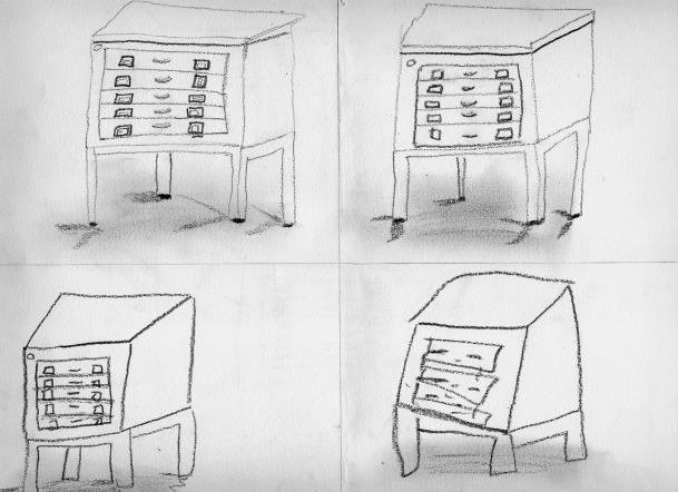 - Permettre de voir la synthétisation progressive de l'objet en même temps que l'apparition de plus en plus forte du geste, du corps du dessinateur en passant par 4 dessins successifs.