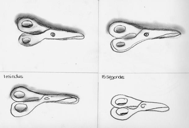 1 feuille A4 séparée en 4 cases, crayon 4B, graphite... et un objet sous les yeux