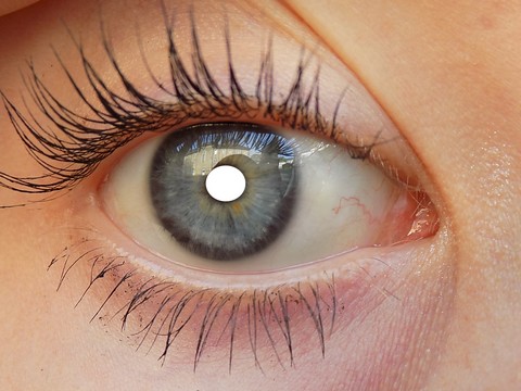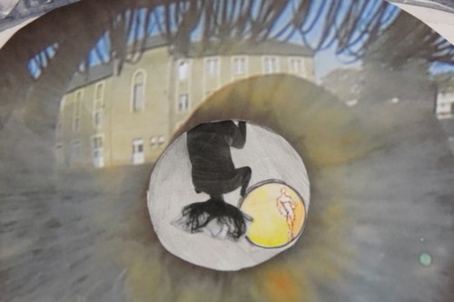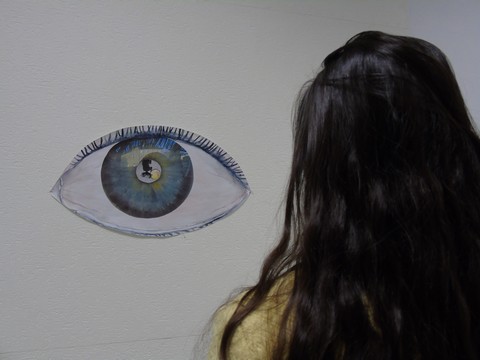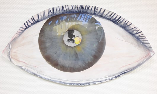 Le travail photographique, quant à lui, a consisté à prendre une photo de l’œil de Mélina de couleur bleue, et pour n'avoir que l'iris, j'ai agrandi la photo sur un format A3 en ayant au préalable supprimé les contours ainsi que la pupille. Le hasard a voulu que cette photo permette de voir en reflet les bâtiments du lycée comme miroir de l'endroit où la photo a été prise, mais aussi les cils.