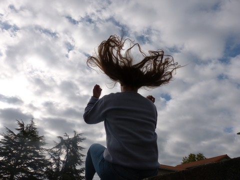 La seconde photo est prise en extérieur, Léa est de dos avec les cheveux en mouvement. Je l'ai imprimée en noir comme une ombre, je l'ai ensuite découpée pour n’avoir que la silhouette de son corps et je l'ai collée à l'envers dans la pupille coloriée en gris au crayon à papier. Le fait de l'avoir collée à l'envers renvoie au diaphragme d'un appareil photo ou à la rétine d'un œil, où l'image est tout d'abord perçue à l'envers avant d'être remise à l'endroit.