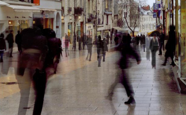 Sur les photos de rue, j'ai voulu montrer les mouvements et les déplacements des piétons. Les personnages les plus foncés sont les personnages « réels », saisis dans leur présent, et les ombres sont celles des personnes présentes au passé et au futur sur l'image, elles ne projettent pas d'ombres.