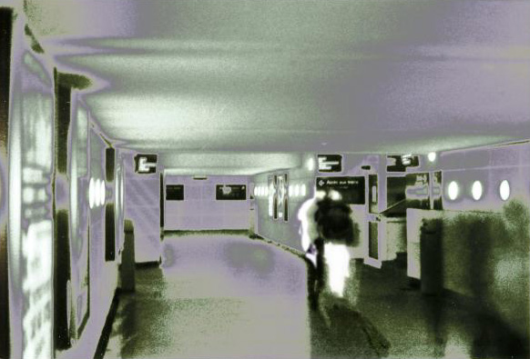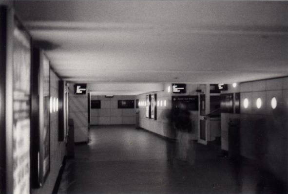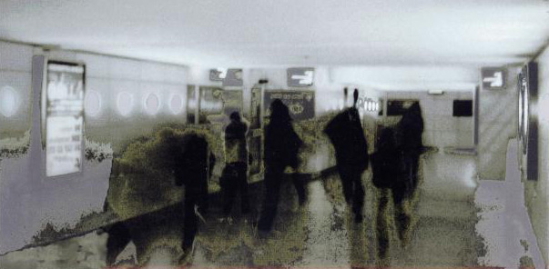 Mon travail se base sur des photos en noir et blanc et en couleur que j'ai prises à la gare d'Angers et dans la rue. J'ai choisi ce lieu pour bénéficier de la foule des gens qui débarquent des trains car j'aime l'ambiance qui règne dans cet endroit à cette heure de la journée : l'éclairage blanc du hall, la lumière blafarde des couloirs d'arrivée donnent aux voyageurs des allures de fantômes.