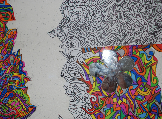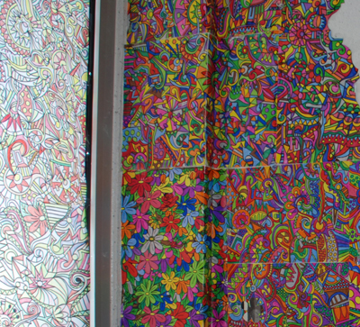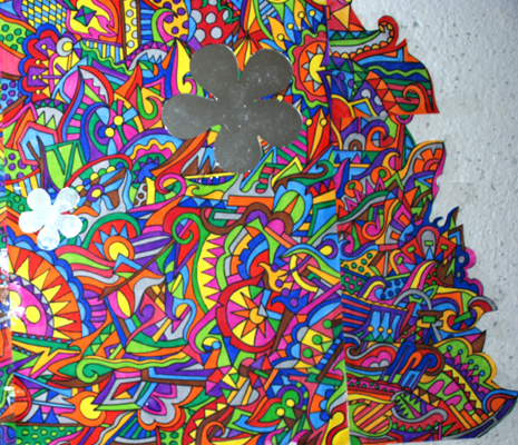 Candy, qui suivait l'option arts plastiques depuis la seconde, est arrivée lors de la deuxième séance de l'année avec une liasse de papiers de divers formats, mais pas plus grands que A4. Tous étaient recouverts d'un réseau serré de motifs noirs dessinés au feutre d'une main sûre. Aucun repentir, chaque forme étant cernée très régulièrement. Un vocabulaire graphique et coloré personnel comprenant fleurs, arcs en ciel, étoiles, volutes, formes géométriques variées. L'ensemble une fois dessiné est totalement colorié de couleurs vives, toujours au feutre. Elle m'explique qu'elle fait ce genre de chose depuis plusieurs années. Candy souhaite être fleuriste depuis l'enfance.