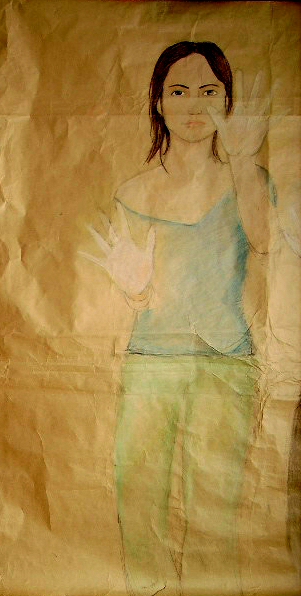 Enfin j'ai opté pour une présentation sous forme de triptyque que l'on pourrait disposer de différentes manières comme si le spectateur pouvait s'associer à mes images tout en étant tenu à distance par la « vitre » suggérée et concrétisée par le dessin de la main. Mes productions à taille humaine sont en quelques sorte les « icônes » tragiques de mon sentiment d'enfermement, les symboles de papier d'une génération contrariée, surprotégée et sous influence.