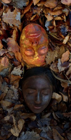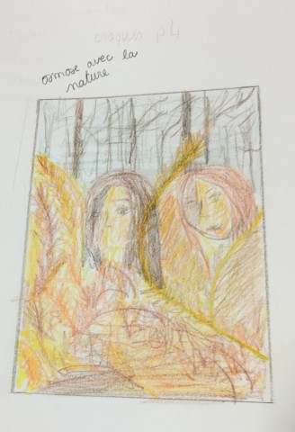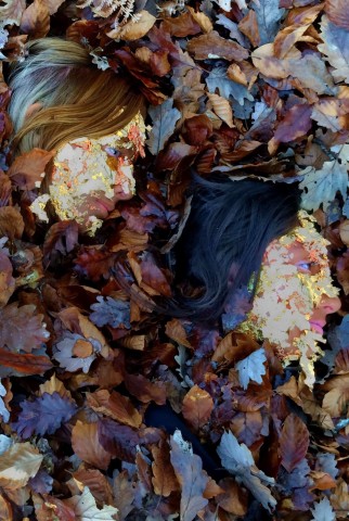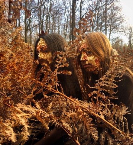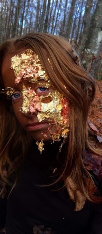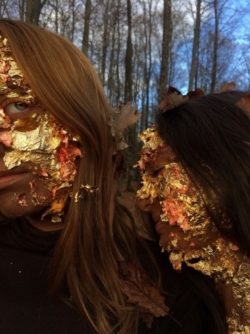 " Pour ce projet, j’ai eu l’idée du trompe-l’œil dont le but est bien de tromper le spectateur en donnant l’illusion de la réalité à une scène. J’ai utilisé pour cela le médium photographique et ai réalisé ce projet avec la participation de deux amies qui m’ont servi de modèles. Pour commencer nous sommes allées en forêt pour mon décor, puis j’ai maquillé leurs visages avec du fond de teint foncé et j’ai également collé des feuilles d’or sur la partie gauche de leurs visages.