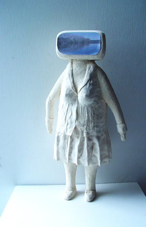 La tête de cette femme-corps a été remplacée par un poste de télévision avec à l'écran une image montrant un paysage.
