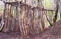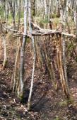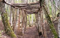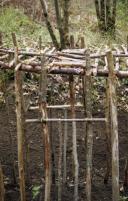 La construction est mise en valeur par le contraste de couleurs (le sol gris noir et les branchages beiges)."