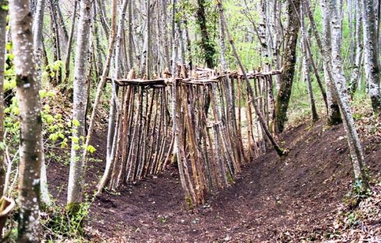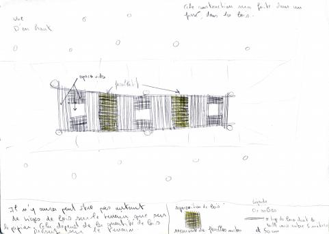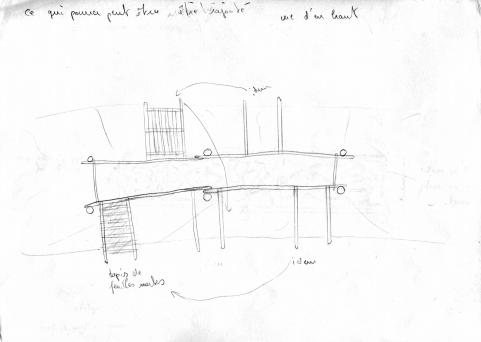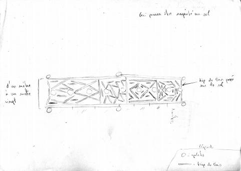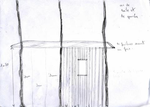 "La construction fait ressortir l'esprit carré de l'homme (structure droite, tiges bien alignées) et contraste avec la douceur de la nature (formes courbes du fossé) et le tapis de "velours" au sol. J'ai voulu dire qu'il faudrait être plus à l'écoute de la nature, s'en inspirer pour l'écologie ou l'architecture, et la préserver.
