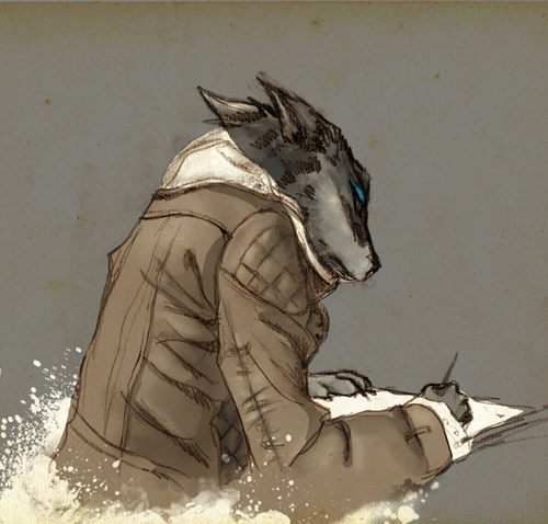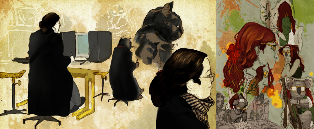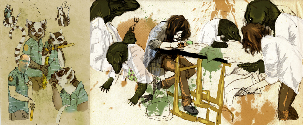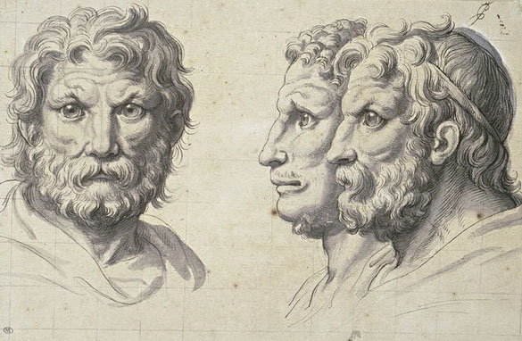 Alix, élève de terminale, a choisi un dessin de Charles Le Brun, daté d'environ 1671, représentant Trois têtes d'hommes en relation avec le lion. Le Louvre possède en deux albums près de 250 dessins physiognomoniques de Le Brun dans lesquels les visages d'hommes sont mis en parallèle avec la tête de l'animal correspondant à ses traits. Si les rapports entre la figure humaine et celle des animaux, illustrés de dessins saisissants, sont les aspects les plus connus de sa théorie sur la Physionomie de l'homme et ses rapports avec celle des animaux, Le Brun ne la limite toutefois pas à ces rapprochements : il s'intéresse fondamentalement à l'interprétation des traits du visage. En traçant des lignes géométriques prenant en compte les éléments de la tête, Le Brun déduit les facultés ou les particularités des hommes et le caractère des animaux. L'animal est vu avec naturalisme, mais avec une « recherche d'expression qui lui donne comme un accent d'intelligence humaine ». Les hommes ont « les traits grossis et déformés, les nez et les bouches reprennent les formes des museaux avec le maximum d'exactitude. Pourtant tout est sérieux, tout est calculé et raisonné avec application » (J. Baltrusaitis, Aberrations. Essai sur la légende des formes). Alix a ainsi transposé les recherches physiognomoniques de Le Brun dans un cadre qui lui était quotidien, à savoir le cours d'arts plastiques, en capturant l'image de quelques-uns de ses camarades dans un premier temps, pour ensuite amorcer, non sans humour, diverses métamorphoses animalières. Ses productions privilégient, dans leur forme, la dimension d'étude (qui est au cœur des nombreux dessins de Le Brun), davantage que l'aspect abouti.