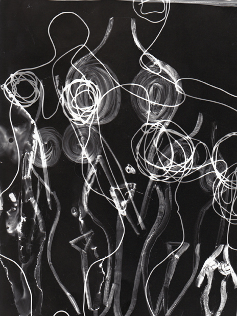 Phase 2 A l'occasion de la verbalisation effectuée autour des images réalisées lors de la phase précédente, les élèves font part de leurs remarques et découvertes. Ils insistent sur : - l'aspect pictural de quelques images, "comme une photographie au pinceau" - l'ambiguïté de ces images "à la fois faites à la main et avec une machine (l'agrandisseur)" - les difficultés à anticiper le résultat, en particulier en ce qui concerne l'inversion des noirs et des blancs "puisque un trait à l'acrylique blanche ne produit pas un noir mais un blanc si elle est appliquée en épaisseur" - la nécessité qui en découle de penser le négatif non comme un jeu de noir et de blanc mais plutôt en terme de transparence et d'opacité - l'usure (plus ou moins marquée) des marqueurs qui permet d'obtenir toute une gamme de gris - l'impression qu'ils ont d'avoir dessiné avec l'ombre et la lumière. Pour réinvestir ces découvertes, une dernière proposition est faite aux élèves : "En réutilisant les techniques expérimentées avec les têtes de caractère, créez librement une nouvelle image de format 18 x 24 cm" |
