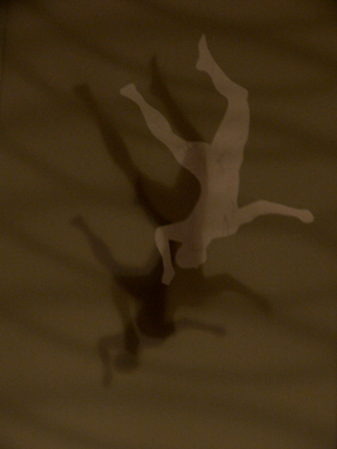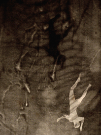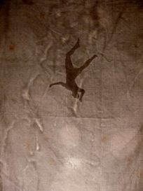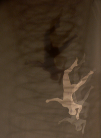 Trois ombres se chevauchent, se chassent, se poursuivent. Cascade de corps, tous identiques. Le second n'est que la trace du troisième, le premier, le souvenir du second, comme si une chronophotographie avait enregistré chaque position successive du corps entraîné dans une chute inexorable, créant ainsi une sorte de vertige.