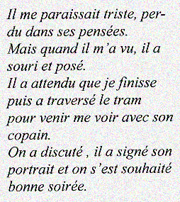 Le fait d'agir de dessiner ouvertement une personne parmi cette masse rompt ce phénomène. C'est une sorte d'invitation à la rencontre. Redonner sa densité à la personne humaine, elle n'est plus qu'une image. Intrusion dans l'intimité. Provoquer les gens et voir leur réaction, un dialogue muet, une relation s'installe. J'ouvre une porte, certains s'y engouffrent, y répondent par un sourire, une conversation, une signature; d'autre se ferment, détournent la tête, se cachent et refusent de se laisser croquer; d'autres encore sont trop absorbés et ne me remarquent même pas, il ne répondent pas à l'invitation et demeurent dans le phénomène de "non prise en considération de l'autre".
